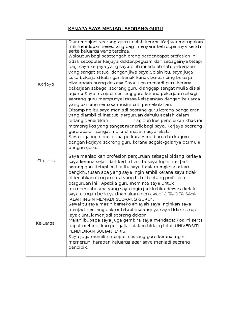 Alasan Menjadi Guru from imgv2-2-f.scribdassets.com Hasrat dan keinginan saya tuk menjadi guru semakin kuat ketika saya melanjutkan pendidikan pada jenjang yang lebih tinggi. Siapa guru yang dapat mengenal beragam karakter? Hal ini adalah apabila kita melakukan sesuatu kerana allah, sudah pasti kita melakukan sesuatu pekerjaan itu dengan sehabis baik. Oct 30, 2011 · 1) saya nak jadi cikgu kerana kerjaya cikgu adalah punca rezeki yang baik. Ketika kita berbagi sesuatu hal yang bersifat materi, maka materi tersebut bisa saja habis dibagikan. Apabila saya menjadi cikgu saya bukan sahaja memperoleh pendapatan , saya juga beroleh ilmu semasa saya belajar untuk mengajar, pahala dan doa doa dari anak murid yang mendoakan saya. Feb 01, 2017 · aku dah pergi lebih kurang 7 ke 8 sekolah dah sepanjang tempoh aku menjadi guru pelatih. Guru adalah pelajar seumur hidup yang menikmati peluang untuk berkembang dan berkembang.